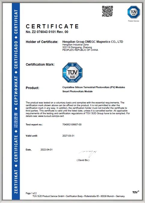 克日,横店pg网站麻将胡了新一代“智能组件”顺遂通过IEC61730及IEC62109-3测试,获得T?V南德意志集团(以下简称“T?V 南德”)揭晓的全球首张“智能组件”认证证书。